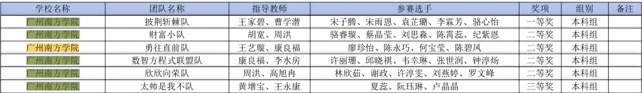 广州南方学院williamhill中国官网宋子腾、宋雨恩、袁芷璐、李霖芳、骆心怡五名同学组成参赛队伍——“披荆斩棘队”,在王家碧、曹学潜老师指导下,荣获本次竞赛全国一等奖;胡宽和周洪老师指导的“财富小队”、王艺璇和康良福老师指导的“勇往直前队”、康良福和李水房指导的“数智方程式联盟队” 荣获本次竞赛全国二等奖;周洪和高旭冉老师指导的“欣欣向荣队”、黄增宝和王永康老师指导的“太帅是我不队” 荣获本次竞赛全国三等奖。