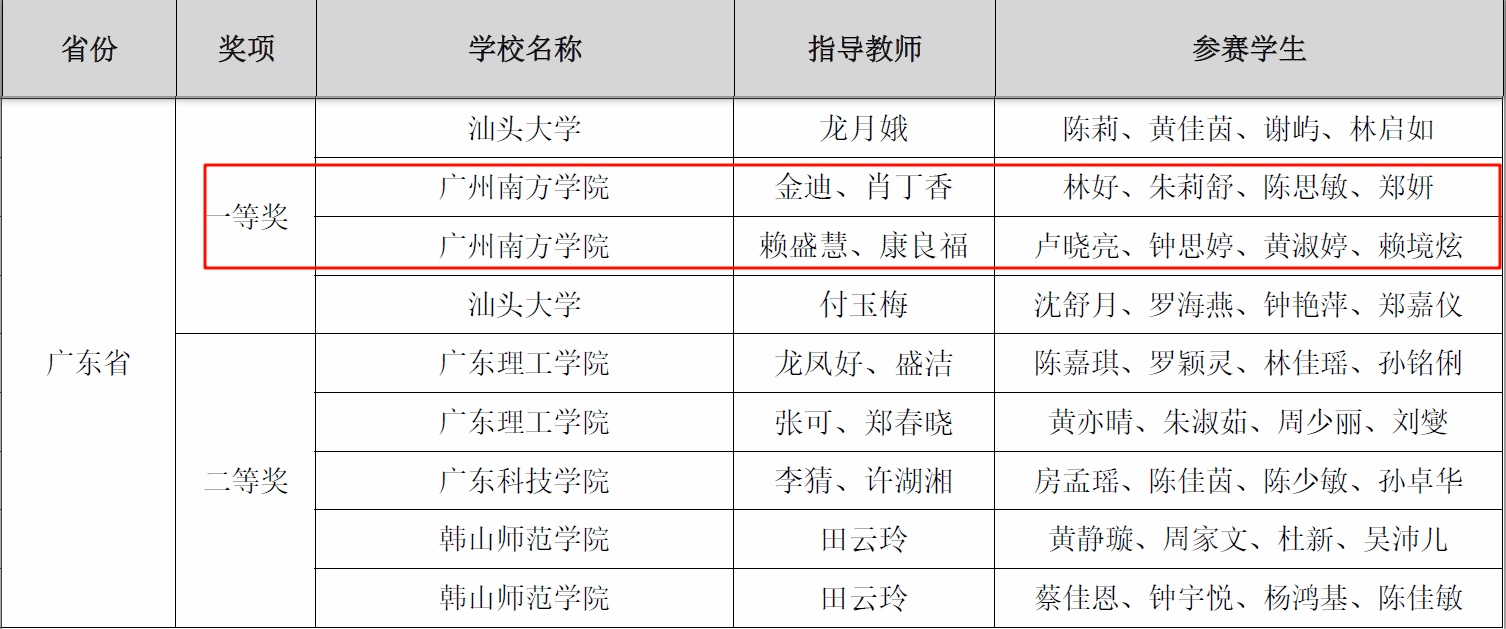 由金迪、肖丁香老师指导的第1支队伍(林好、朱莉舒、陈思敏、郑妍),以及赖盛慧、康良福老师指导的第2支队伍(卢晓亮、钟思婷、黄淑婷、赖境炫),在广东省内20多所高校、40支本科组参赛队伍的激烈比拼中,凭借扎实的专业功底和出色的实操能力脱颖而出,最终将代表广东省晋级全国总决赛,与全国34个省市的100多所知名高校一起同台竞技。