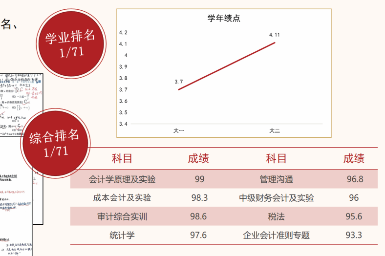图书馆里有她奋斗的身影,课堂里有她专注的身姿,课本上有她刻苦的痕迹,成绩有她青春奋斗的记录……入学以来,所有课程考试成绩优秀率100%,专业课必修课平均成绩可达96.9分,年级综合素质总排第一,学业排名第一,获得年级双桂冠。四次获得院级奖学金,考取初级会计证书,获课堂“专注之星”称号等佳绩。