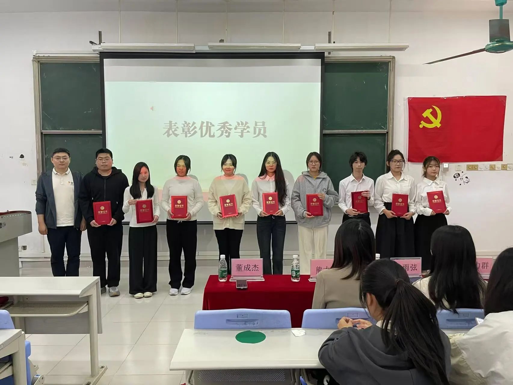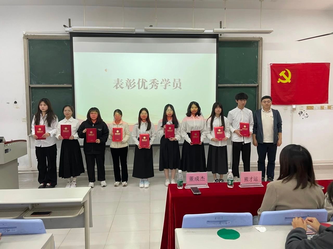 主持人宣读了在本次长征精神专题学习班中展现出极高红色素养,并在结业考核中斩获优异成绩的同学名单。黄倩仪、吕依凌、赖科同等18位同学荣获“优秀学员”称号,并由董成杰老师为他们颁发“优秀学员”荣誉证书。