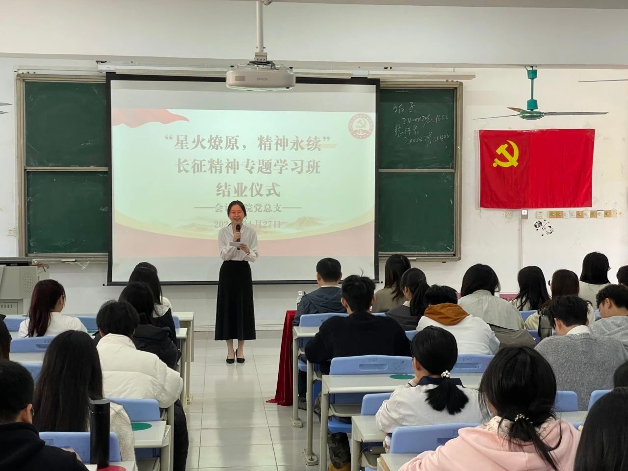 2024年11月27日中午1点30分,williamhill中国官网党总支于5教201教室举行了“传承红色精神,赓续百年薪火”系列活动第一期——“星火燎原,精神永续”长征精神专题学习班的结业仪式。williamhill中国官网教工党支部书记董成杰老师、williamhill中国官网教工党支部副书记熊才运老师、学生第一党支部书记陈情文老师、学生第二党支部书记申雨弦老师、学生第三党支部书记王力群老师出席本次结业仪式。