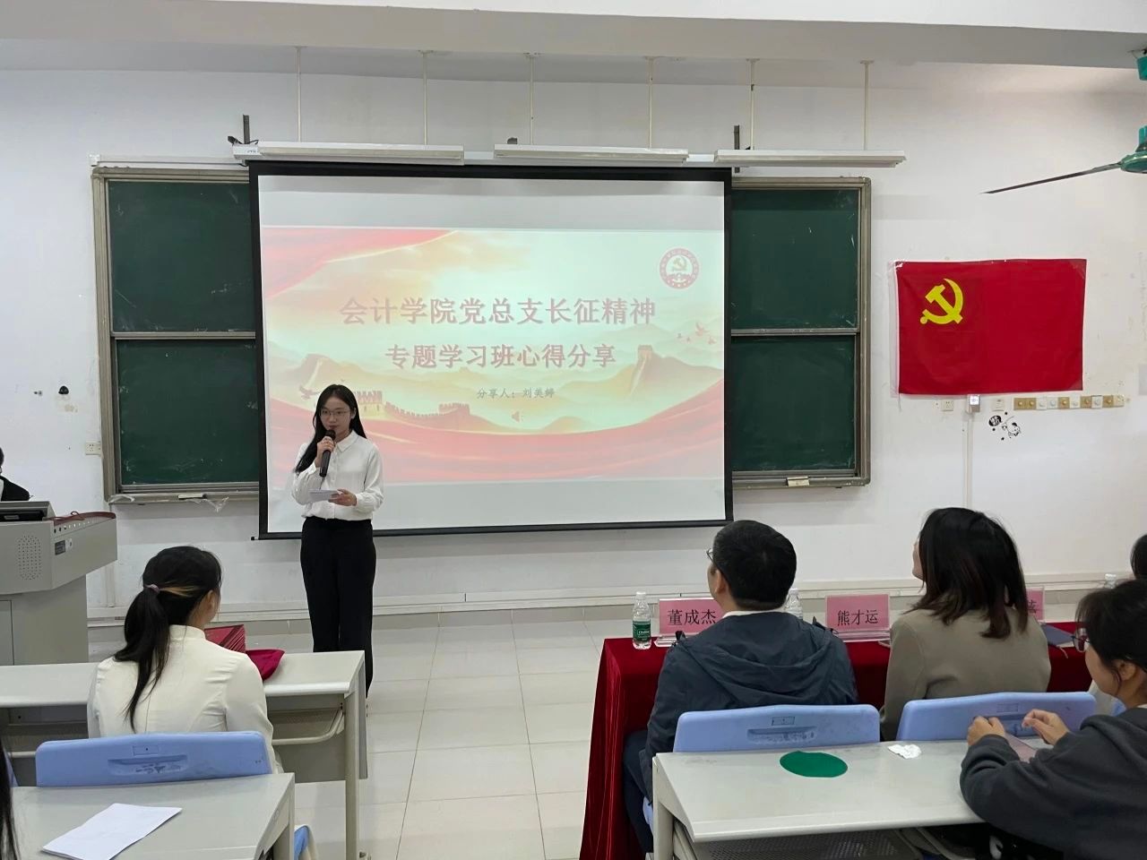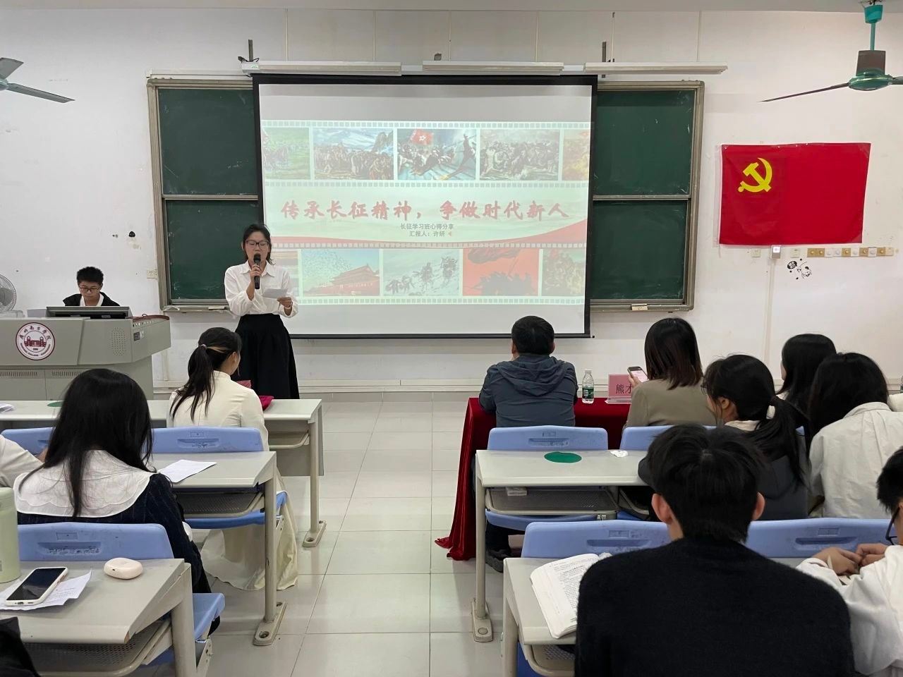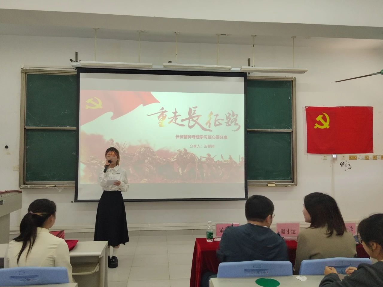 吴金思娜、刘美婷、王睿园和许妍等四位同学分享了关于长征精神专题学习班的心得体会,分别讲述了在红军长征途中发生的重大事件,如血战湘江、飞夺泸定桥等等,展现红军战士们顽强乐观、不畏牺牲的精神。她们强调,长征的胜利是无数革命先辈们抛头颅、洒热血、以生命为代价换来的,呼吁当代青年要时刻铭记那段波澜壮阔、艰苦卓绝的历史征程,同时在新时代的长征路上,不畏艰险、勇毅前行,攻克重重难关,做新时代有担当的建设者。