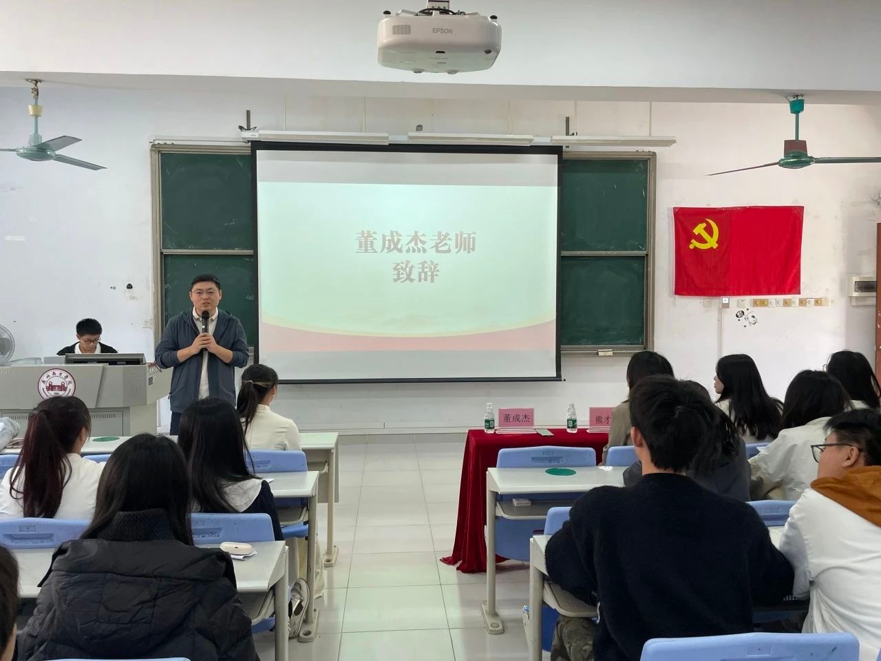 董成杰老师为本次结业仪式进行致辞。董成杰老师以中国共产党成立初期的境遇与中华人民共和国成立后的迅速发展作比较,告诫同学们要对未来抱有期待,要给自己树立信心。此外,董成杰老师对同学们给予了殷切期待,提醒同学们要时刻怀揣着决心与毅力,坚定自己的理想信念。
