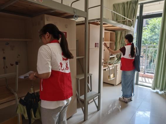 在申雨弦同志的带领下,学生党员分组进入宿舍楼,逐一核查新生宿舍中的配置情况,确保每张床铺、书桌及椅子都稳固耐用,可以满足日常的需求。同时检查空调、水龙头等设施是否损坏。在检查的过程中,她们细致入微、尽职尽责,将所存在的问题及时上报处理。