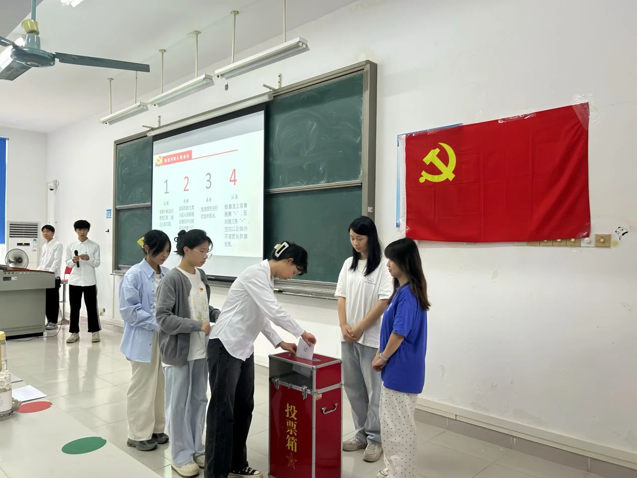 随后,主持人介绍了大会的议程以及投票规则,确定黄馨仪同志为监票人,朱文曦同志为计票人,并提出会议表决方法和监票人选定的提议,提议得到全票通过。