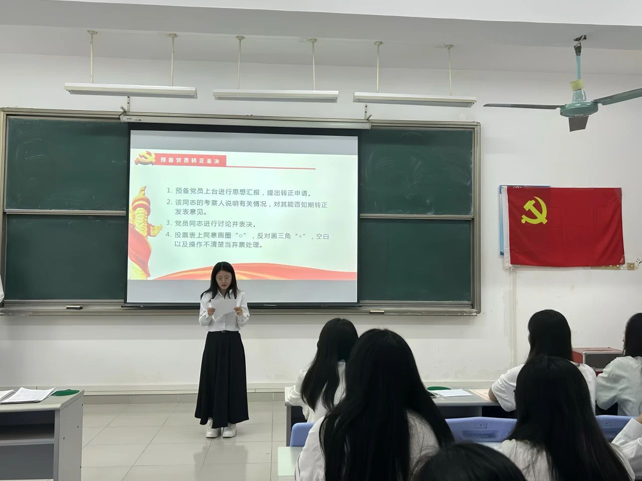 大会的第三项议程:预备党员转正表决。本项议程是对预备党员郑彦玲等6名同志的入党转正问题进行讨论并表决。预备党员们依次上台,认真汇报了自己在成为中共预备党员一年以来的思想、工作与学习等各个方面的进步和变化,表明了他们用实际行动积极向党组织靠拢的决心,并为之付诸行动。与此同时,预备党员们表示自身还存在一些不足并会在今后学习、工作和生活中做出改进,时刻以一名合格的党员标准来严格要求自己,树立良好形象,发挥自身先锋模范作用。入党考察人对预备党员期间的表现进行总结并发表意见,对支部各预备党员按期转正给予肯定和认可。