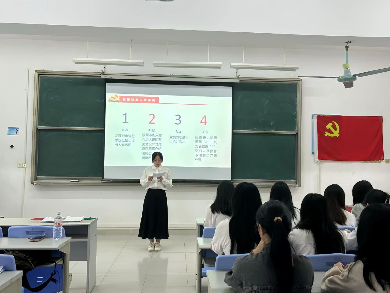 大会的第二项议程:发展对象入党表决。本项议程是对发展对象罗庆霜等5名同志的入党问题进行讨论并表决。各发展对象逐一上台汇报,表示自己在过去的一年里,沐浴在党组织的教育与培养下,不断提高思想政治觉悟,增强党性修养,坚定共产主义理想信念,表明自己对中国共产党的忠诚,有为共产主义奋斗终身的决心,现郑重向党组织提出转为预备党员申请。各发展对象的入党介绍人汇报了发展对象们在考察期间的表现以及对各位发展对象在考察期间所作出的成绩和努力给予肯定。