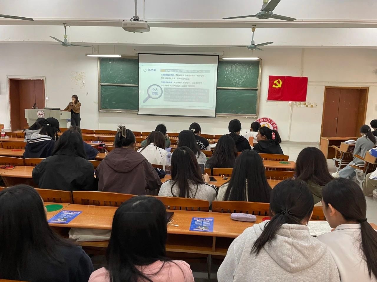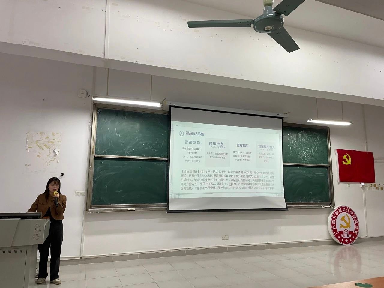 随后,活动进入了反诈骗知识宣讲环节。严志华老师结合当前高发的诈骗手段,向学生们普及了各类诈骗案件的特点和防范技巧。在讲解过程中,严志华老师结合自身经历特别强调了网络购物、网络游戏、冒充公检法等常见诈骗手段,提醒学生们要保持清醒头脑,切勿轻信陌生人的信息。