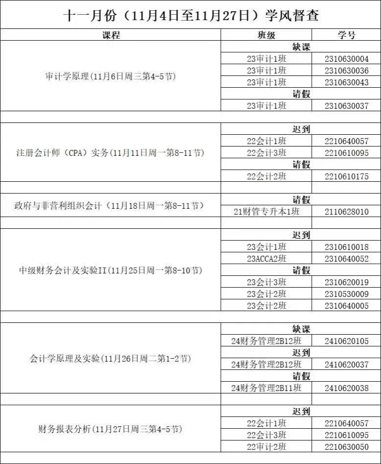 现将11月4日至11月27日(第十周—第十三周)考勤情况公示如下:
