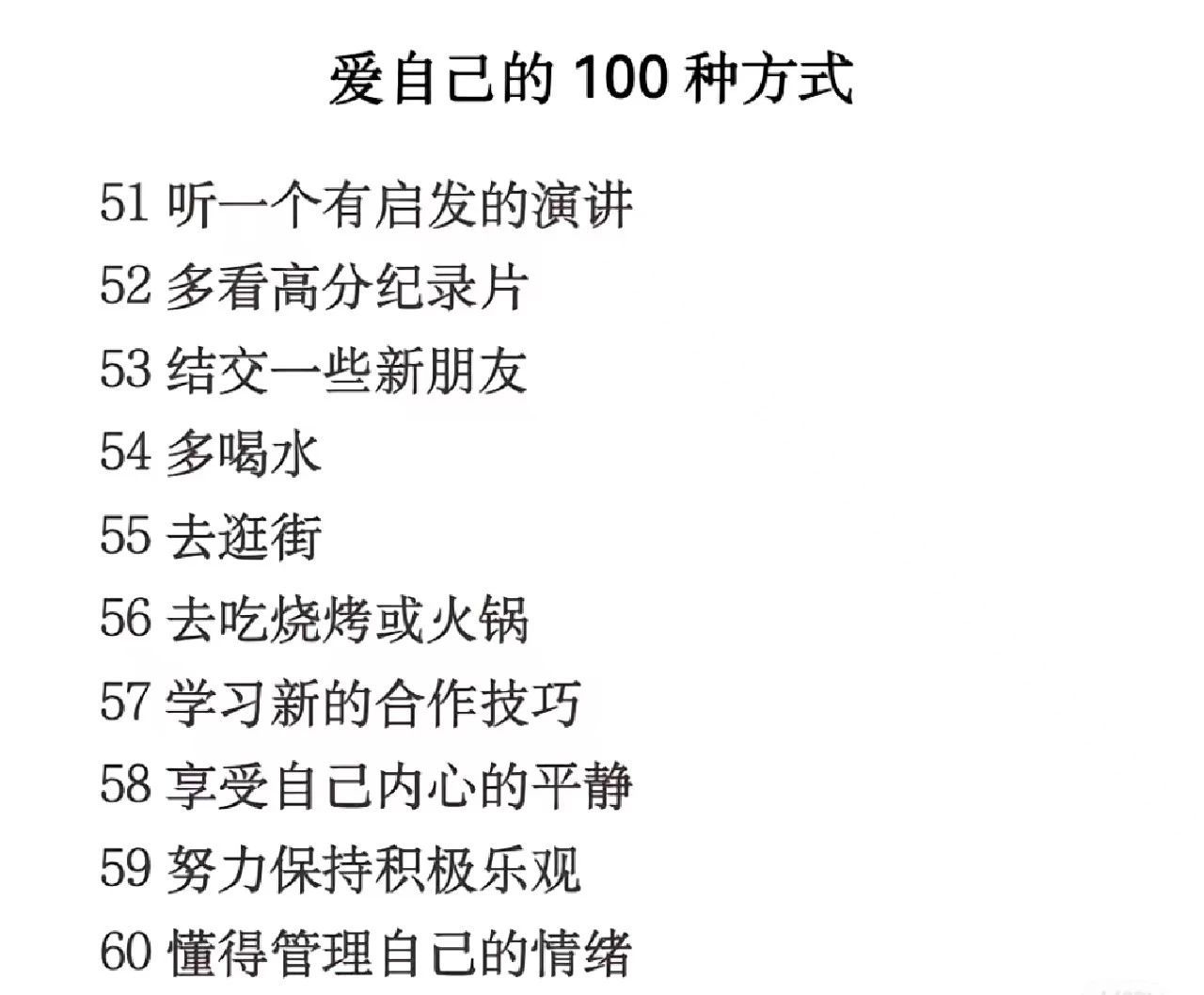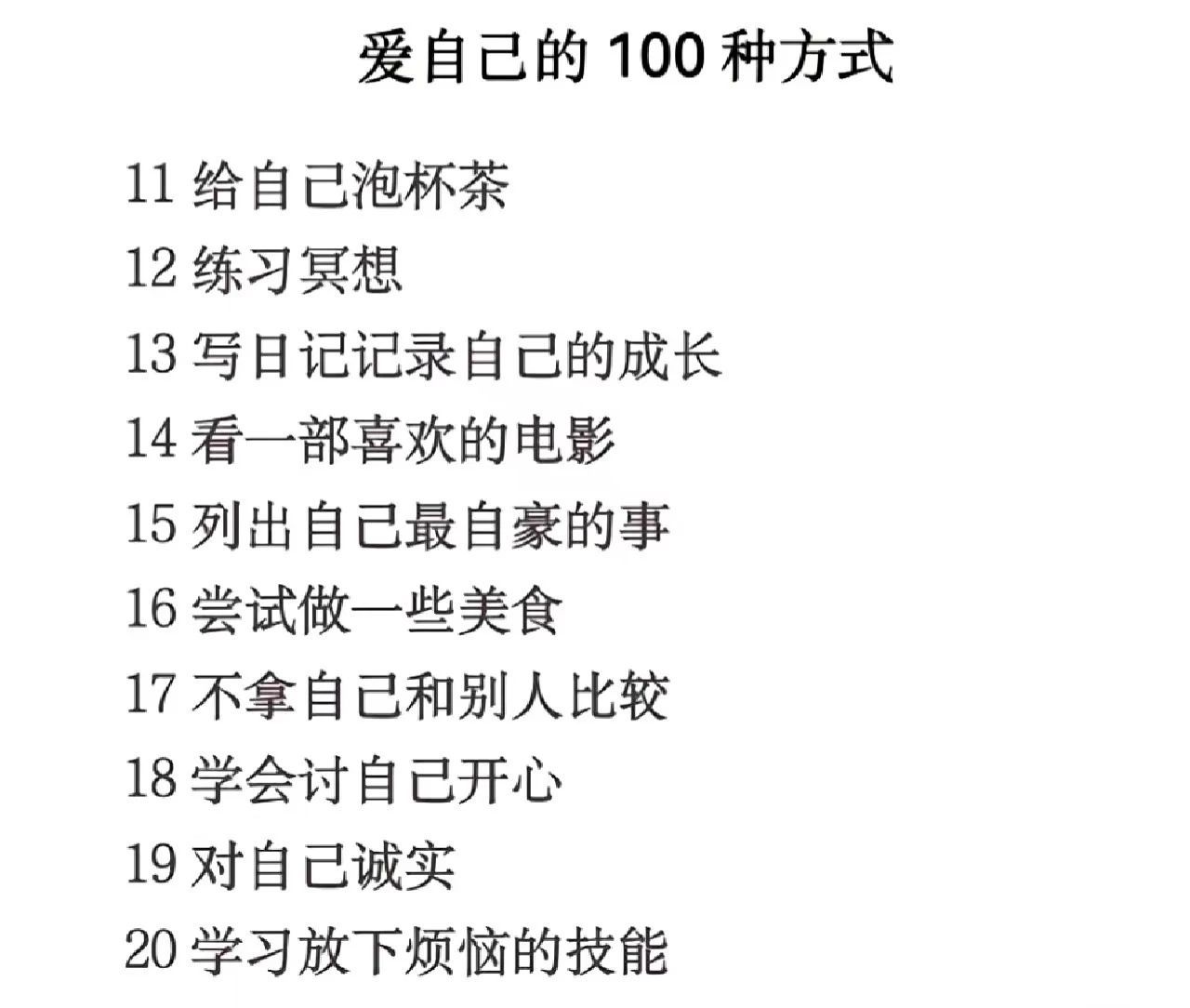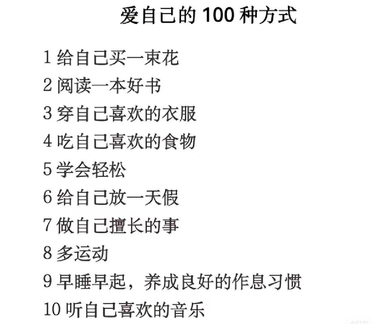 活动内容:依据下文中展示的《爱自己的100种方式》,完成相应的活动,可把活动过程拍成照片或视频,照片人物要清晰,符合要求可加1个成长学时。
