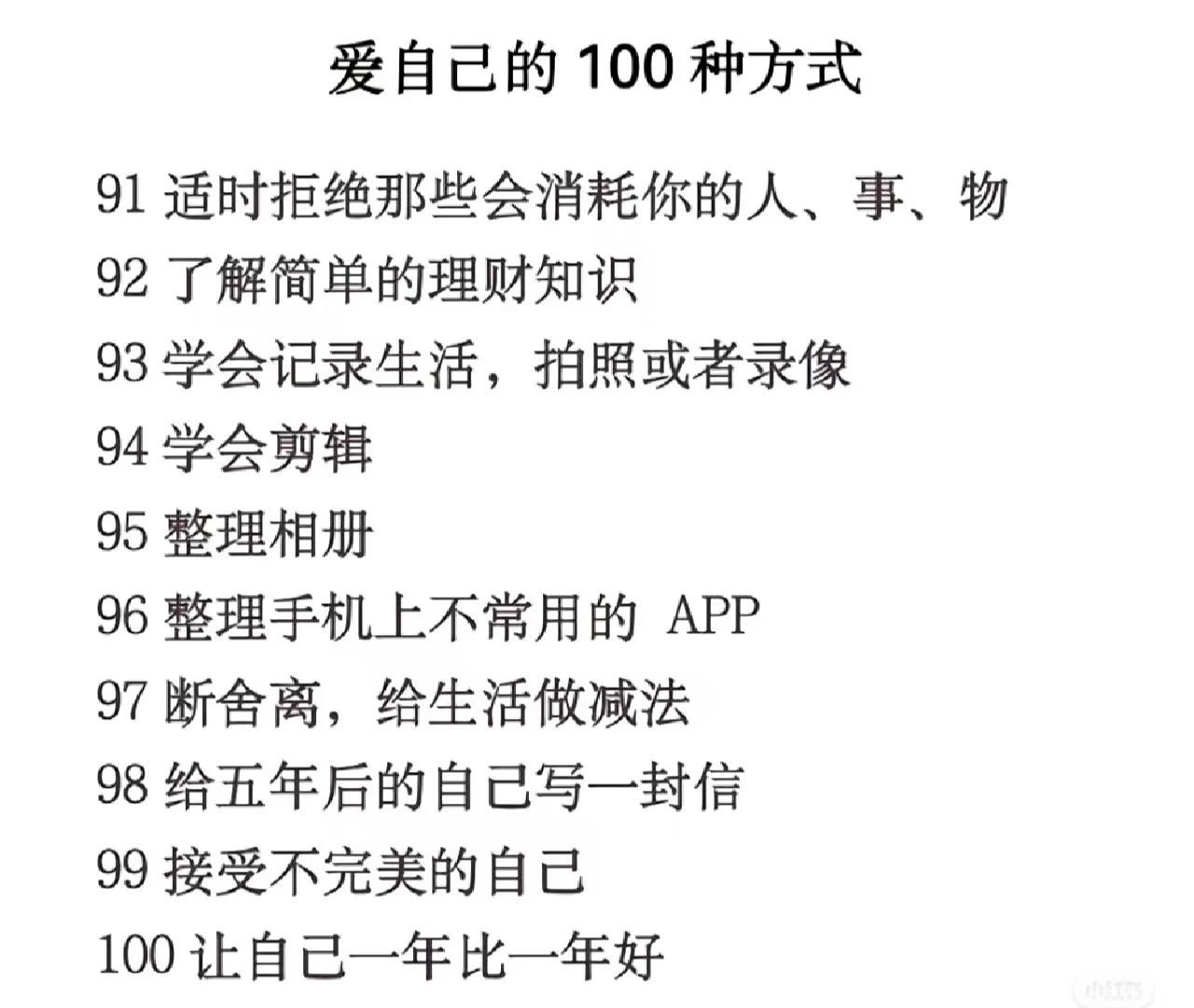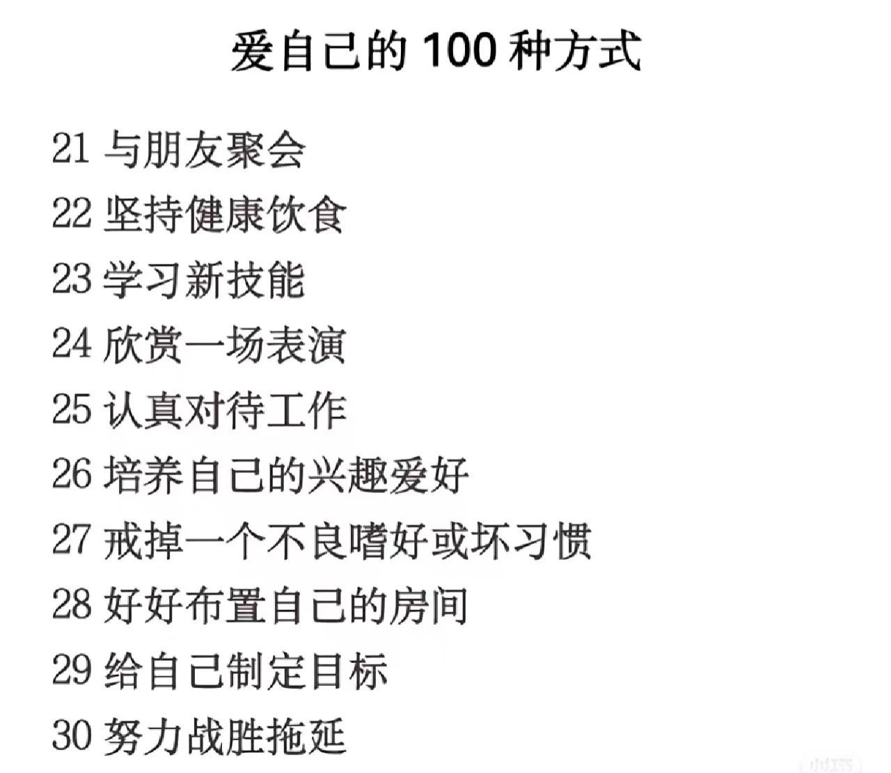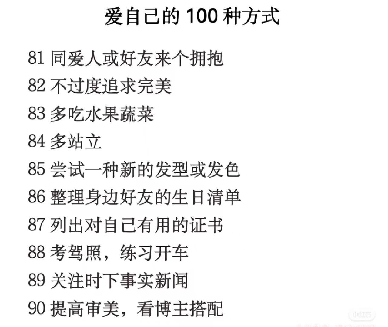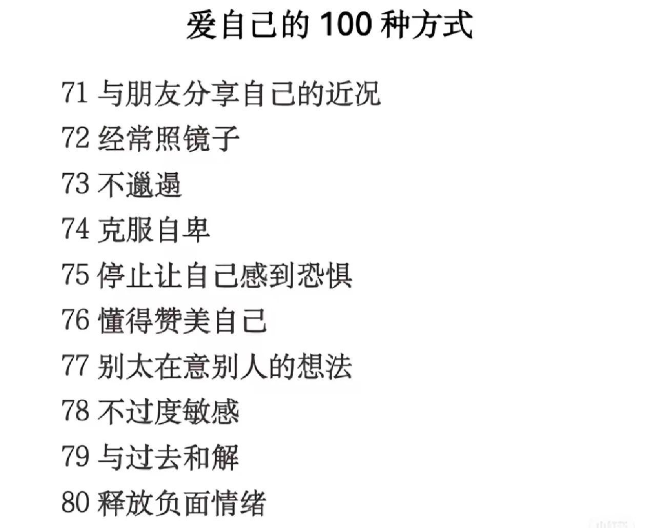 活动内容:依据下文中展示的《爱自己的100种方式》,完成相应的活动,可把活动过程拍成照片或视频,照片人物要清晰,符合要求可加1个成长学时。