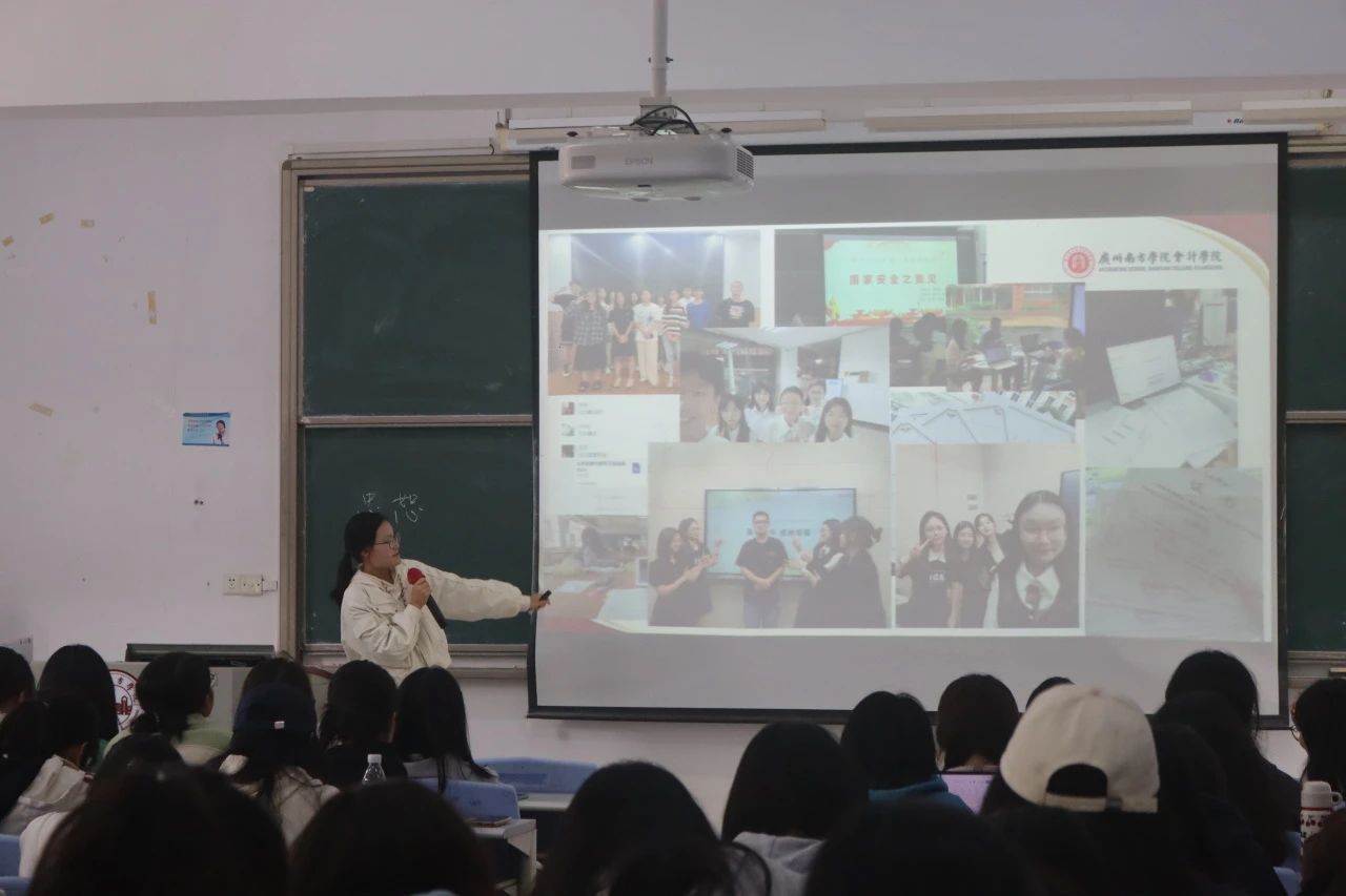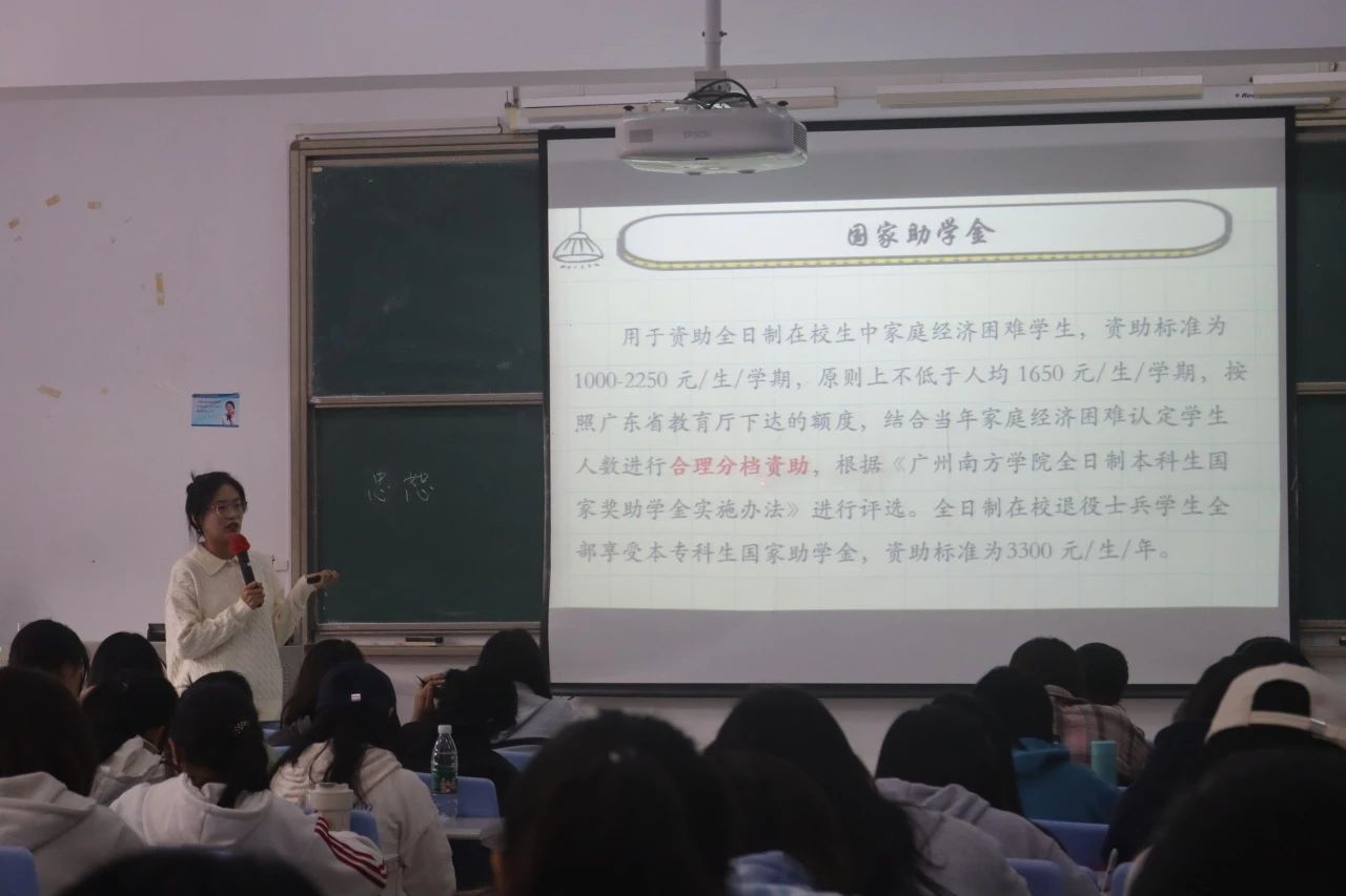 优秀的学姐们分享完后,由刘盼盼老师展开对广州南方学院学生资助工作实施办法的详细讲解。此次讲述分为四个部分。第一部分为国家资助项目,刘盼盼老师从国家奖学金、国家励志奖学金、国家助学金等国家资助项目进行讲解,对其获得条件以及实施条件进行详细的讲解。第二部分为学校资助项目,讲述了绿色通道、新生励志奖学金、勤工助学、临时困难补助、学校奖学金等资助政策,鼓励同学们积极参与学校的资助活动中。第三部分为社会资助项目,刘盼盼老师讲解道学校会利用校友、企业等社会资源开拓社会奖助学项目,项目类型丰富。第四部分为同学们提供了几点准备方法,在准备奖学金前,需要特别留意综合素质测评和家庭经济困难认定两者的评定,同时鼓励想要获得奖学金的同学们在学分绩点以及综测方面上努力,在比赛与学科竞赛方面也不能落下。