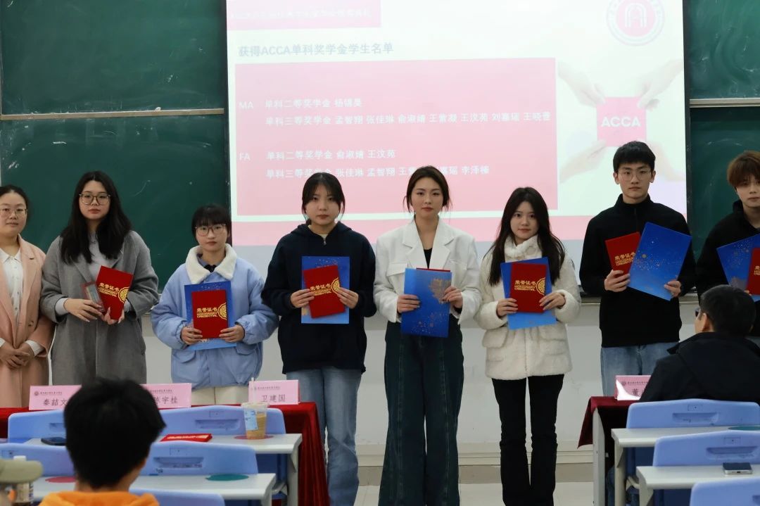 紧接着,秦喆文老师向同学们介绍了ACCA各项奖学金的考核期限与评定标准,逐项宣读获奖名单,老师们为颁发获奖证书和奖品,并合影留念。其中陈芯妍等多位同学屡次上台,收获多项奖学金荣誉,吸引同学们奋发学习,努力向师兄师姐们靠拢。曾涛老师作为教师代表发言,通过讲述ACCA优秀学员的事迹激励在场的同学们要珍惜时光,结合ACCA学习计划做好学业和职业规划,他勉励同学们要全力以赴,争取在未来的全科考试中取得优异成绩。