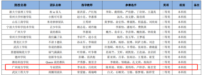 此外,陈米娃、欧盼、黄玮玮、卢梓淳、陈芷莹五名同学组成参赛队伍——“专业团队”,在李水房、吕欣欣老师指导下,荣获本次竞赛全国二等奖佳绩。