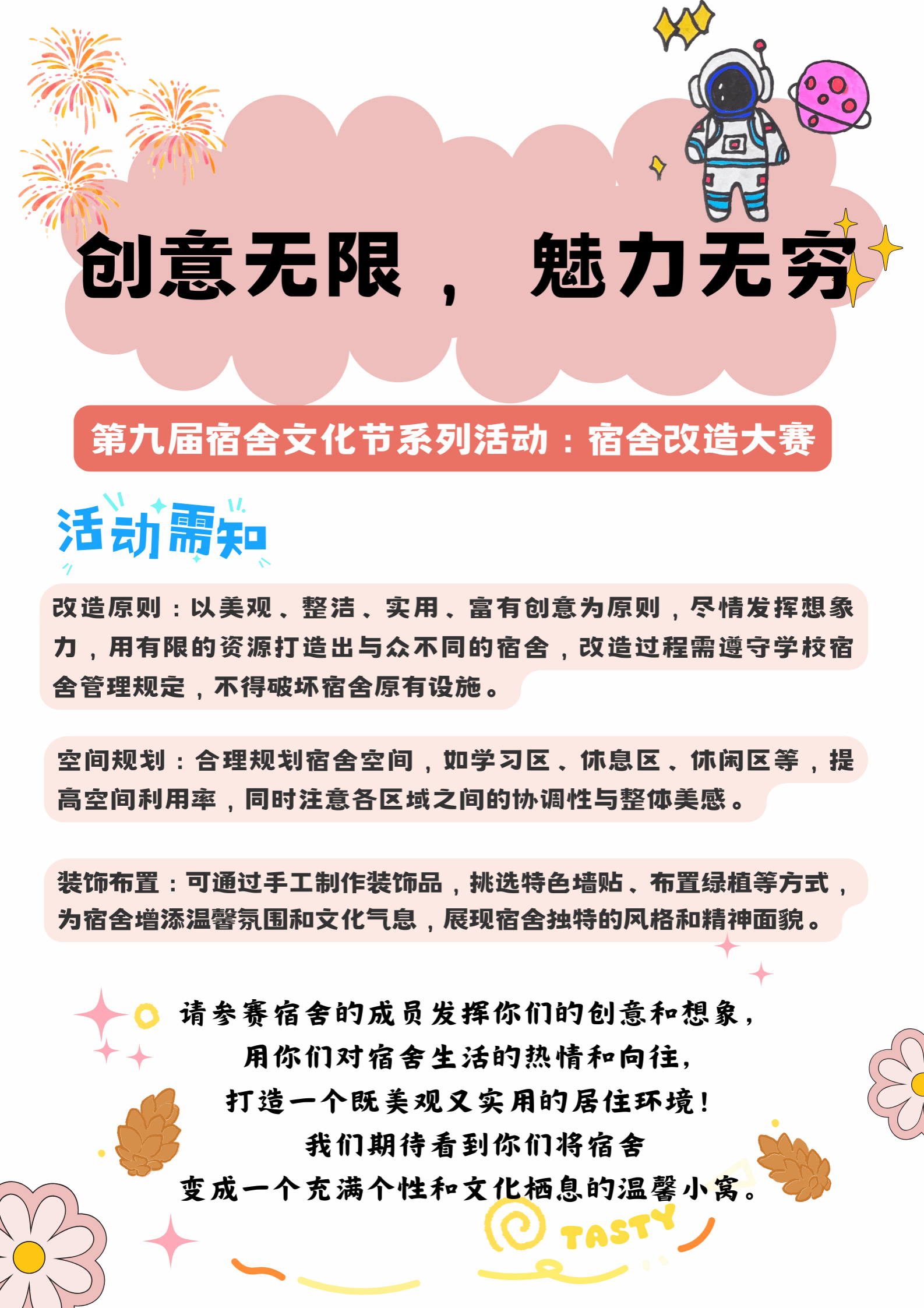 宿舍四个人相遇在青春的散文诗里,共同奔赴大学这一章节的浪漫,宿舍文化节的大门已然敞开,我们诚邀同学们积极挑战自我,参与本次活动,绽放不一样的光彩,共同书写属于你的大学生活!