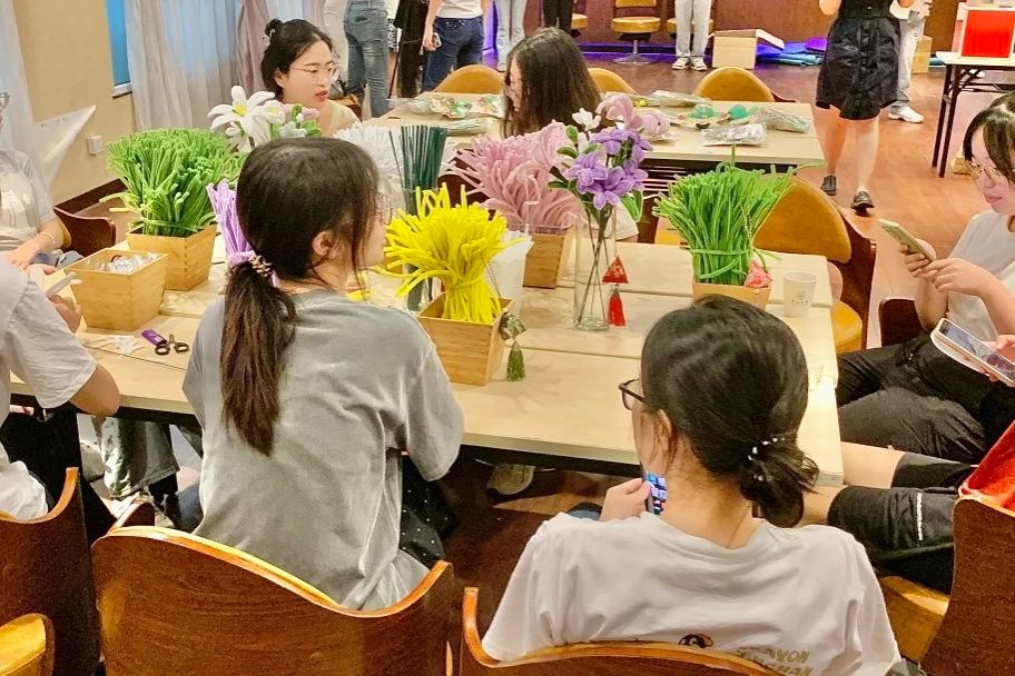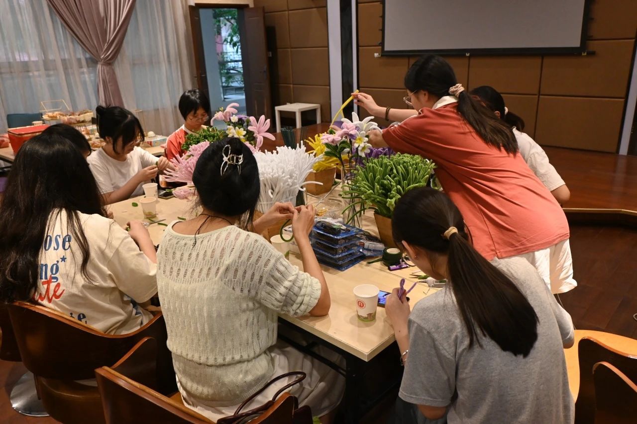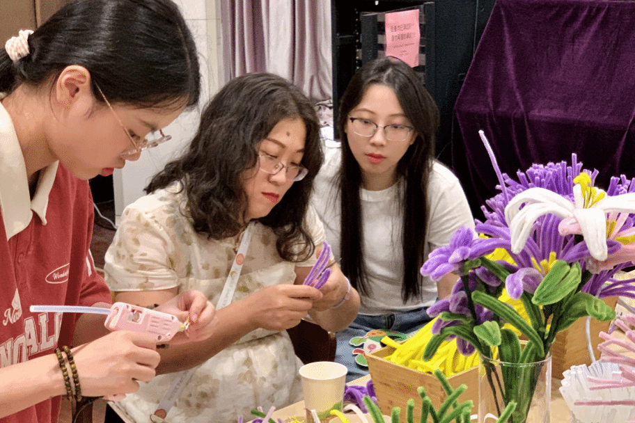 “裁云作花,剪月成叶”。绒花制作环节中,老师们专注学习制作技巧。在示范同学的讲解下,通过捻丝、弯折、组合等步骤,一朵朵精美的百合、桃花、铃兰在指尖绽放,让传统非遗技艺焕发新的生机。