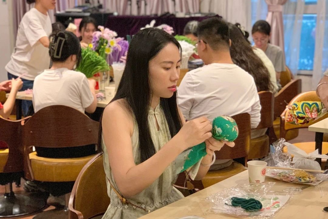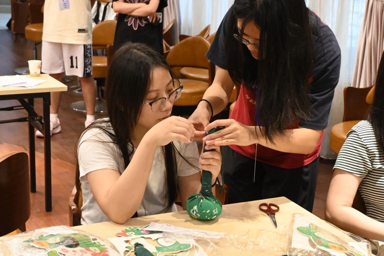 “手执艾锤招百福”。老师们在示范同学的指导下,专注地体验艾草养生锤的制作。从填充艾包到缠绕棉绳,大家认真完成每一个步骤,制作出造型圆润、紧实耐用的养生锤。轻轻挥动间,艾草清香扑面而来,既驱散暑气,又传递着端午安康的美好祝福。