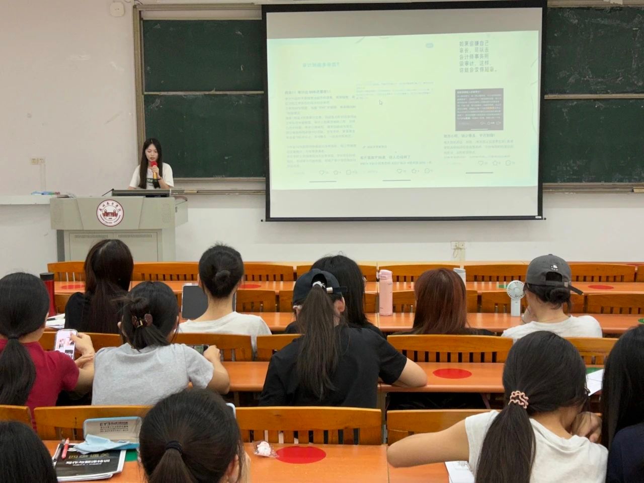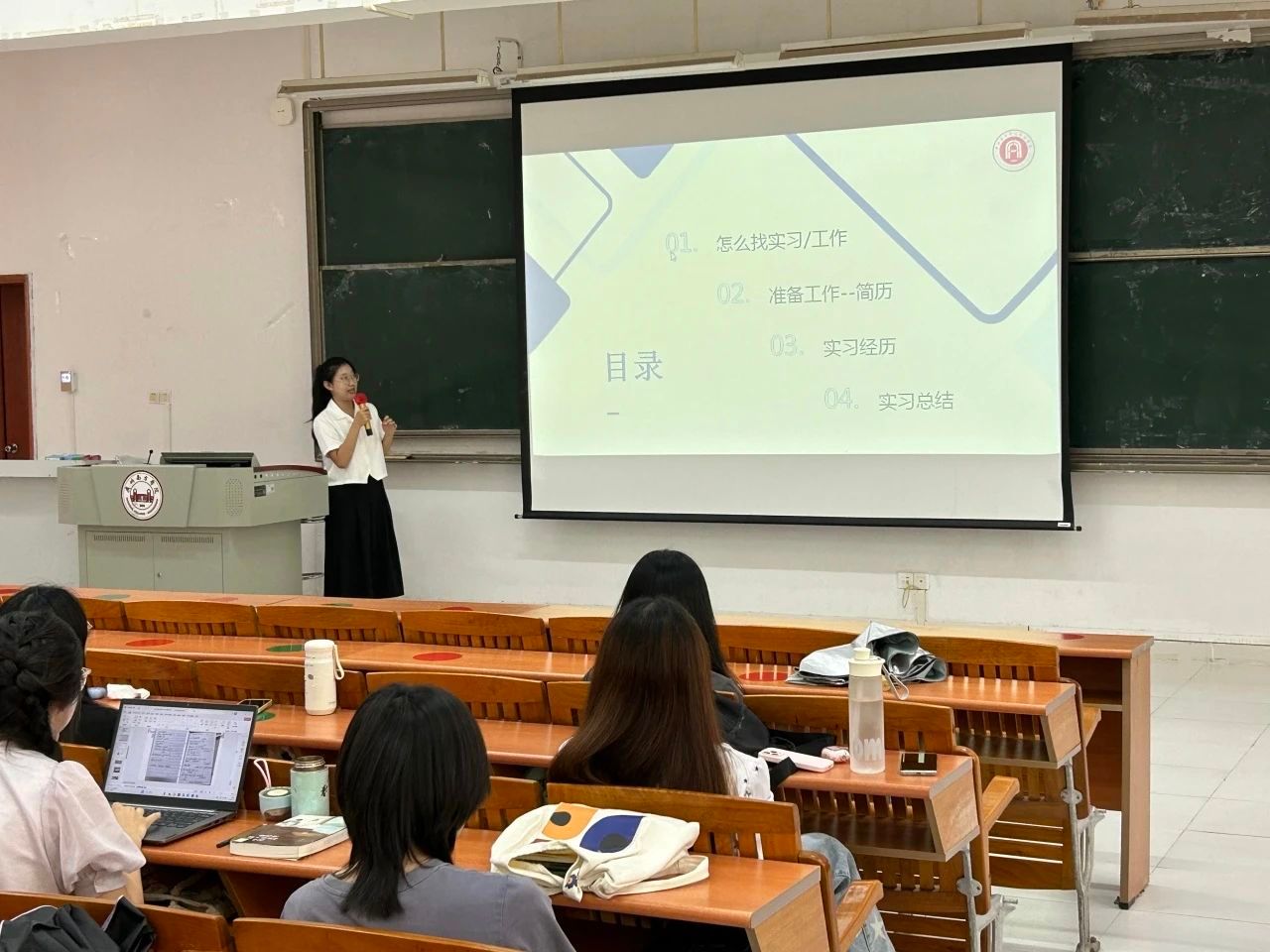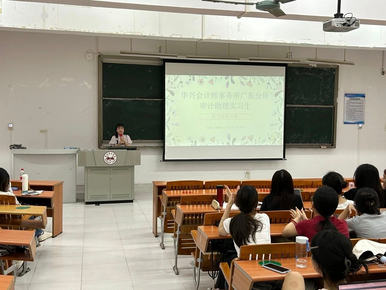 随后,六位优秀实习学生代表分别向同学们详细介绍会计师事务所的实习内容和目前行业发展需求,分享他们各自的实习工作经验。首先是郑妍同学结合自身实习经历,分享实习前期的简历制作和快速适应职场新环境的技巧。郑妍同学强调,一份优秀的简历要牢牢把握岗位匹配度、实习和校园经历、以及专业技能三个方面,让简历在众多实习生中脱颖而出。与此同时,提前了解实习单位的业务方向和企业文化,主动与同事沟通交流,是快速帮助自己融入团队并顺利开展工作的关键。
