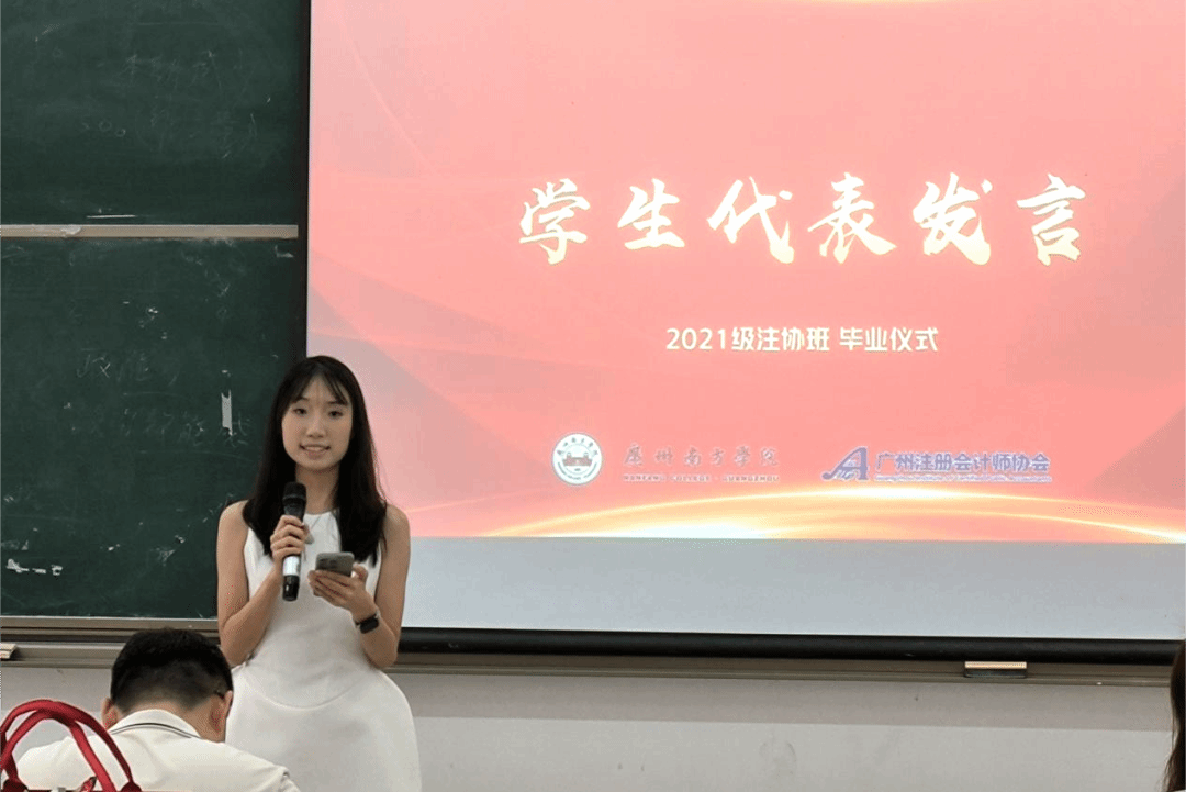 毕业生代表黄梓圆同学上台发言。她回顾了“注协班”学习期间的点点滴滴,表达了毕业生们对大学生活的眷恋,对未来的憧憬,以及对母校和老师的感恩之情。