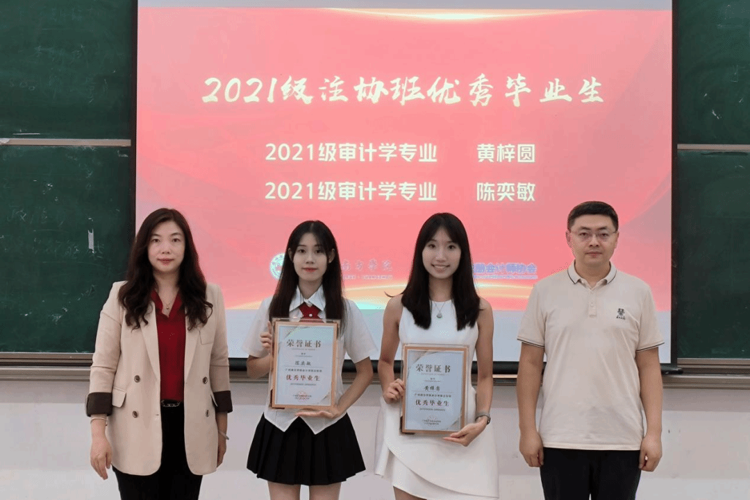 在宣读优秀毕业生名单环节,黄梓圆、陈奕敏两位同学凭借优异的学习成绩和突出的综合表现,荣获2021级“注协班”“优秀毕业生”称号。董成杰、张媛副院长为她们颁发了荣誉证书,全场以热烈的掌声向两位优秀学子表示祝贺。