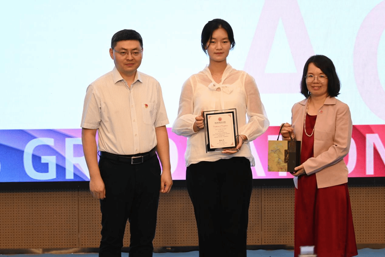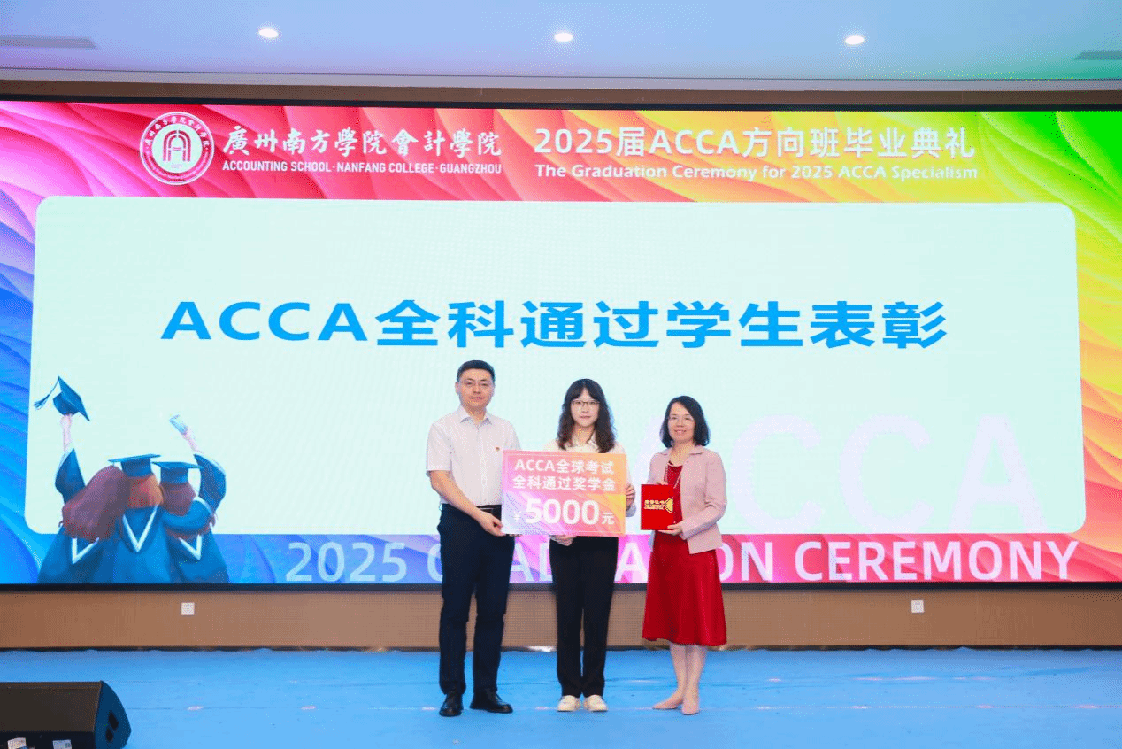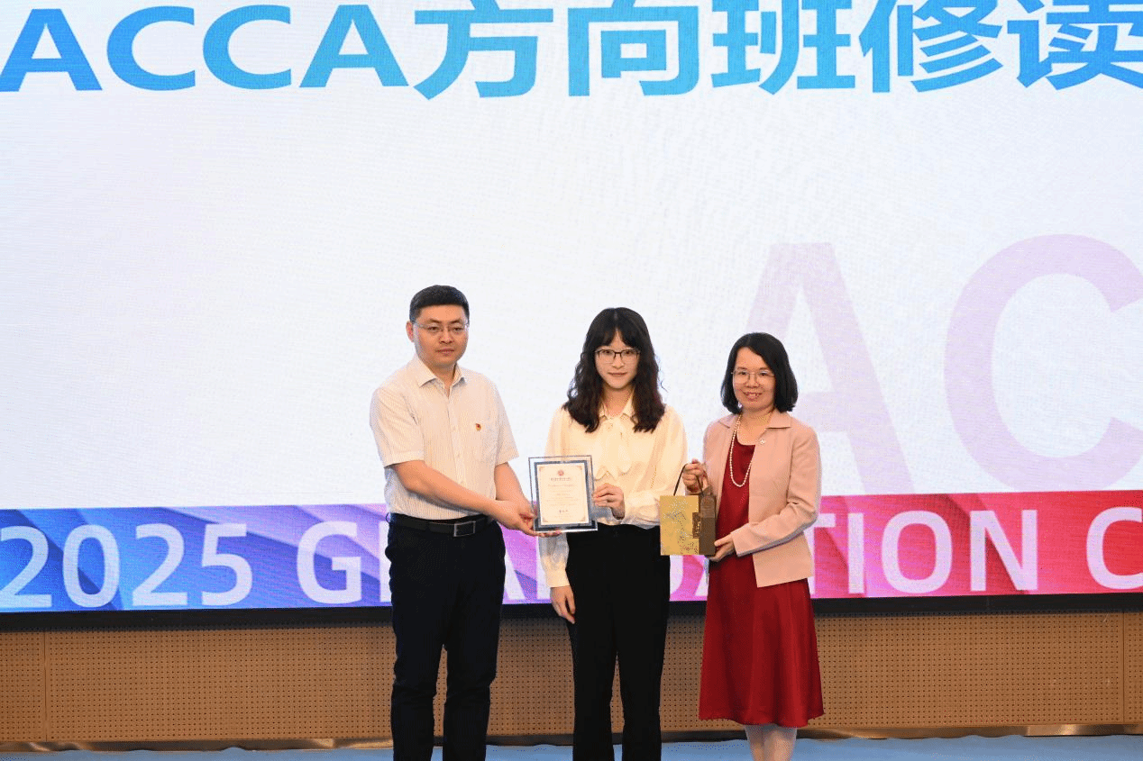 典礼还特别表彰了ACCA优秀毕业生陈芯妍,陈芯妍同学作为21级ACCA方向班第一位完成ACCA全部课程考试的学生,同时考取了雅思7.5的高分,并斩获了包括墨尔本大学在内的多所海外名校Offer。董成杰副院长和谭颖敏总监共同为其颁发荣誉证书及5000元奖学金,以此勉励同学们再接再厉。