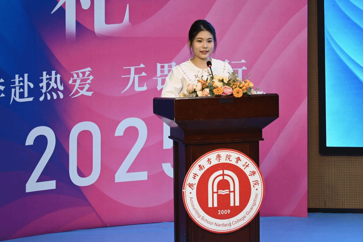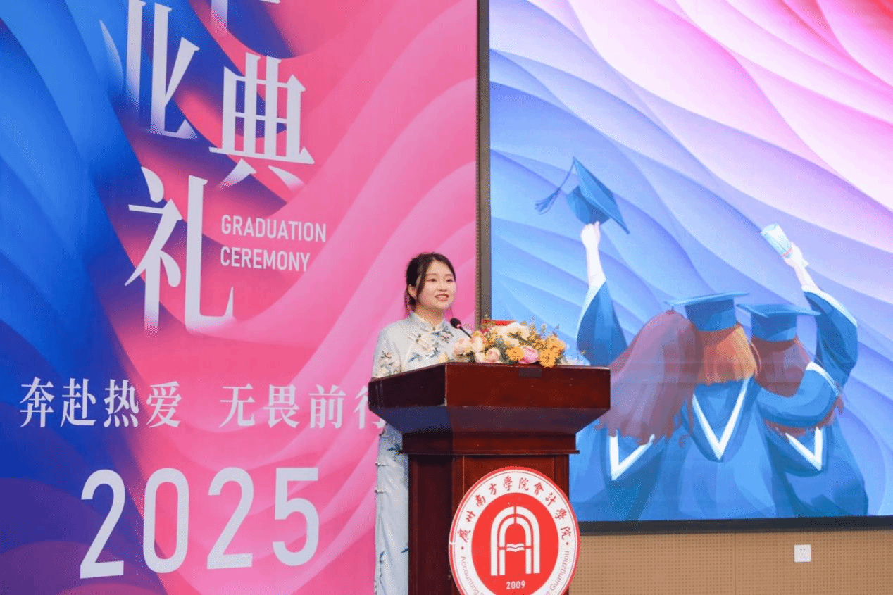优秀毕业生代表陈雨诗同学登台发言。她深情回顾了在ACCA方向班学习生活的难忘时光,表达了对学院、老师、父母和同学的衷心感谢。她分享了学习ACCA的收获与感悟,并代表全体毕业生承诺,将不负母校培养,带着ACCA赋予的专业能力和国际视野,在未来的人生道路上砥砺前行,为母校增光添彩。