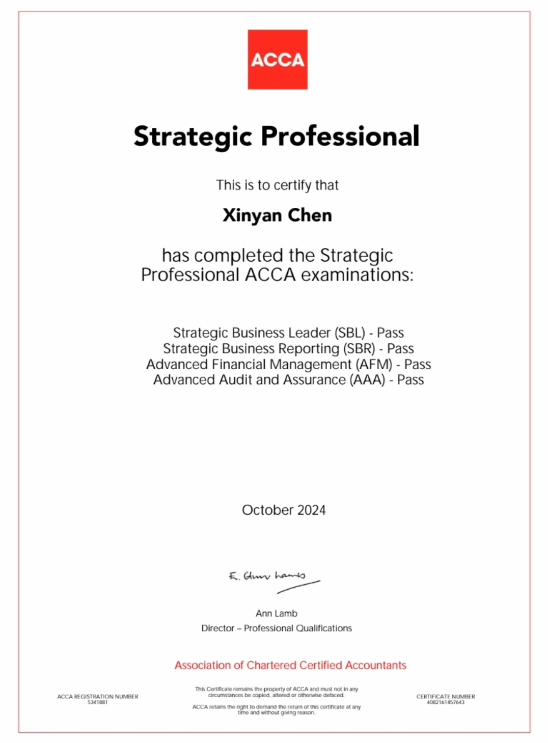 近日,英国特许公认会计师公会(ACCA)公布了2024年度9月考季的ACCA全球考试成绩,广州南方学院williamhill中国官网2021级ACCA方向班陈芯妍同学仅用两年9个月的时间已全部通过ACCA的13门课程,成为williamhill中国官网又一名在本科阶段全科通过ACCA考试的学生,顺利成为ACCA协会的准会员。
