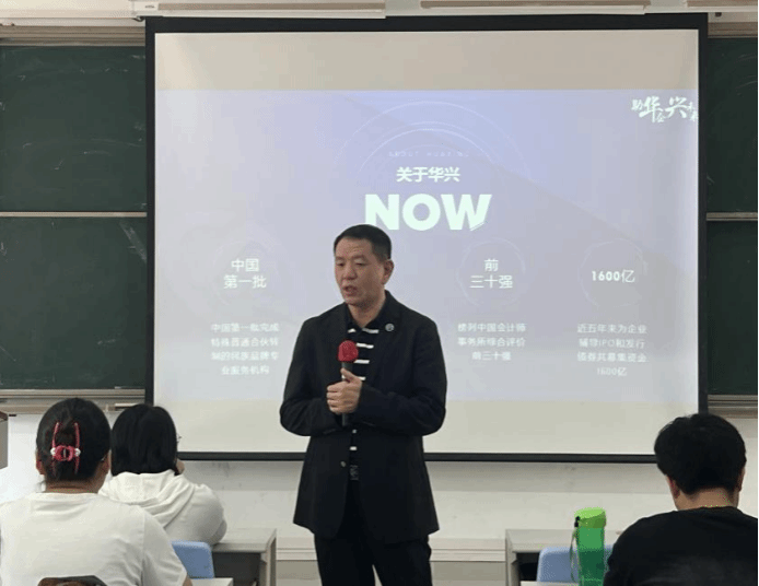 随后,高级合伙人王韶华先生结合个人工作经历对华兴会计师事务所广东分所进行重点内容介绍,包括其主要业务范围、模式、主要客户群体等,带领同学们更全面的了解华兴会计师事务所的相关项目概况、定位、日常工作事项以及招聘岗位需求等内容。另外,王韶华先生以现今国际形势变化表明证券市场对财会专业人才的需求和能力提升是非常有利的,鼓励同学们勇攀高峰,不断的在专业实习和职场就业中提升自己的专业水平。