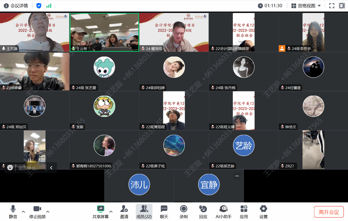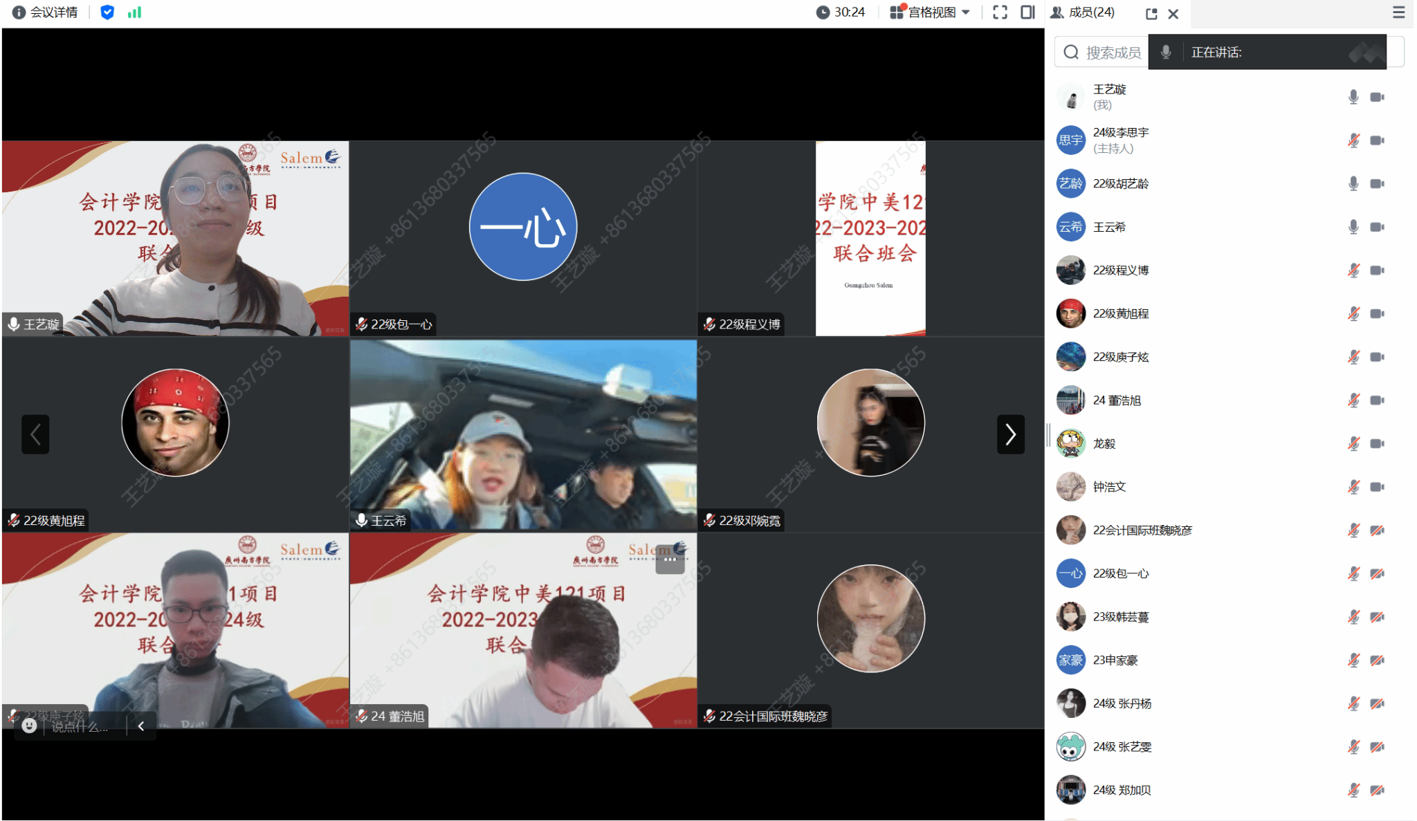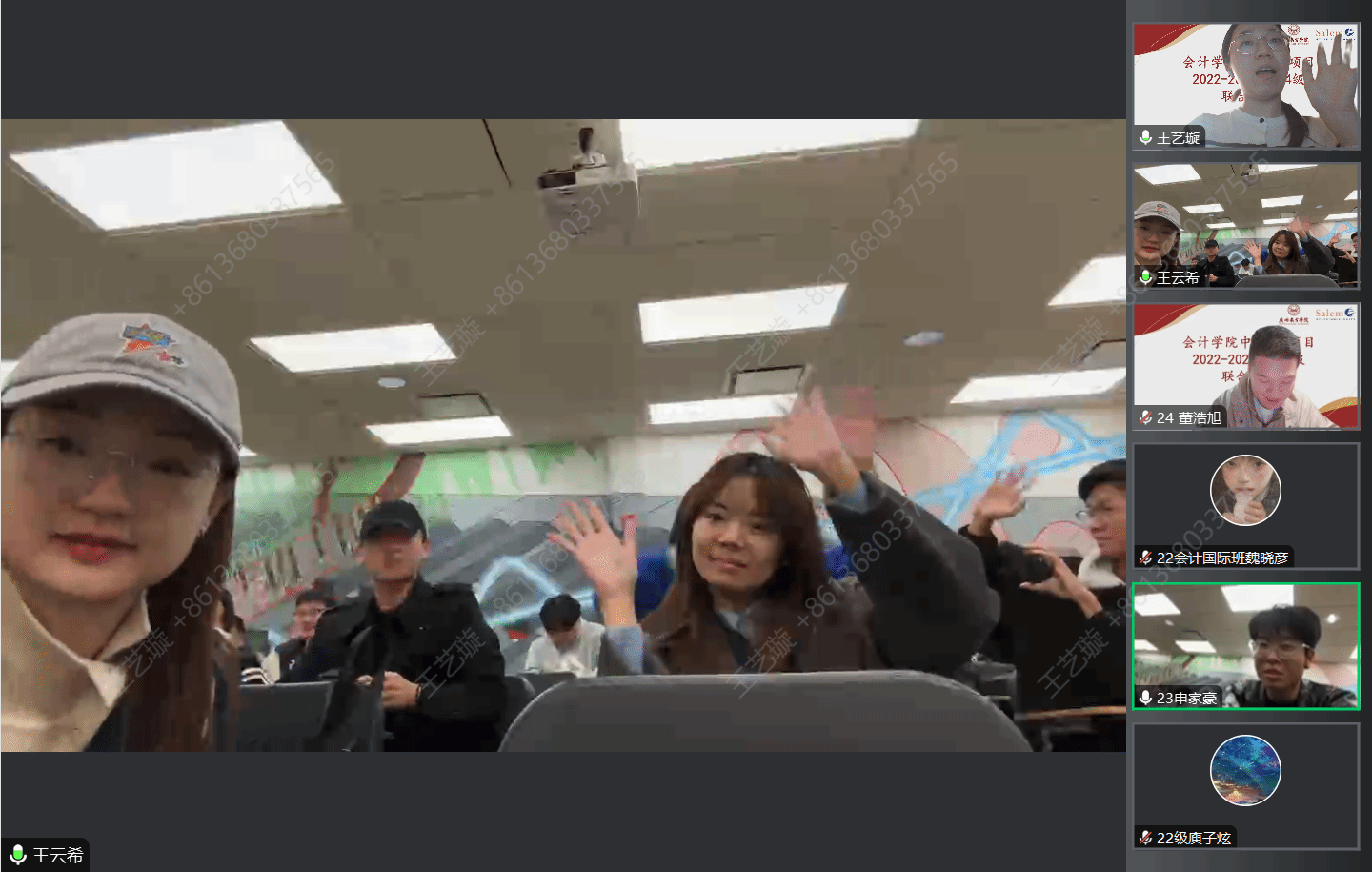 本次班会通过腾讯会议平台,在中美两地同步举行。三届国际班班长联合牵头组织,班委们共同参与筹备。班会由22级班长魏晓彦、23级班长邓宜静、24级班长李思宇担任主持人。22级、23级班主任王云希老师前往美国塞勒姆州立大学现场参会,24级班主任王艺璇老师线上参会。