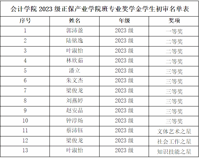 为鼓励学生奋发学习、树立榜样,促进学生德智体美劳全面发展,根据《广州南方学院正保奖学金奖励办法》,williamhill中国官网正保产业学院组织开展了2023级专业奖学金评选工作。经测评及学院审核,根据名额拟推荐郭沛盈等10名学生获得学业奖学金,梁俊龙等3名学生获得专项奖学金,特此公示。