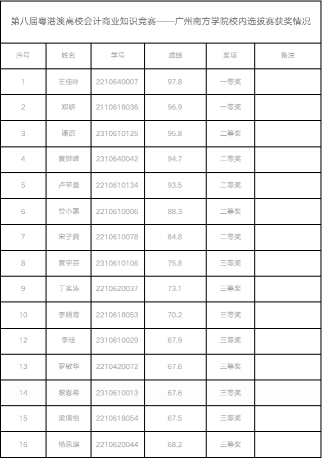 2024年9月24日,第八届粤港澳高校会计商业知识竞赛——广州南方学院校内选拔赛顺利举行,经过激烈的竞逐,以下同学成绩优异,予以嘉奖。