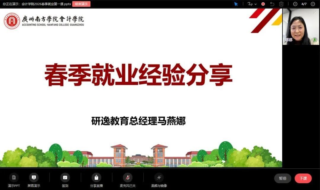 为落实毕业生就业工作部署,扎实做好2026届毕业生就业指导服务,有效激发学子求职主动性,2026年3月6日,广州南方学院williamhill中国官网以线上直播形式成功举办春季“就业第一课”,覆盖全院2026届毕业生。课程采用“领导授课+校友分享+老师动员+辅导员提醒”的多元形式,紧扣会计专业特色与就业市场实际,为学子春招之路精准导航、赋能助力。