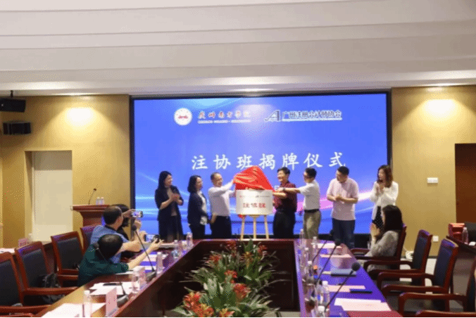 随后,双方进行了注协班揭牌仪式,广州注师协秘书长朱子放、副秘书长李泳茹、副秘书长胡坚、williamhill中国官网执行院长卫建国、副院长董成杰、副院长张媛代表双方进行了揭牌。