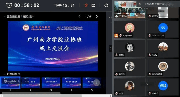 2022年3月23日下午,广州南方学院与广州注册会计师协会(以下简称“广州注协”)合办的注协班项目于线上召开交流会。广州注协副会长兼秘书长朱子放、副秘书长李泳茹、主任罗唯,williamhill中国官网执行院长卫建国、副院长张媛,及16名实务导师代表、2020级注协班全体同学参加了本次会议。