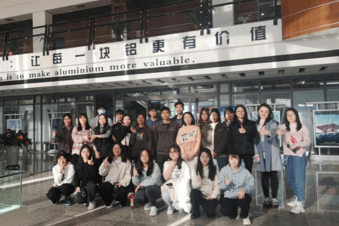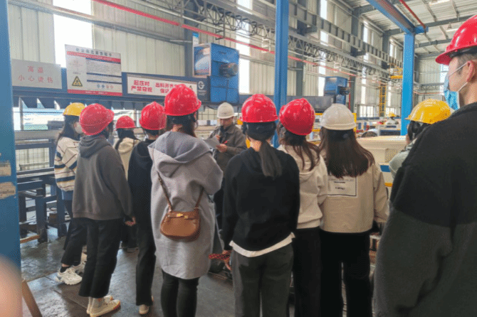 下午,在孔导师、内核主任会计师何经理、挤压厂彭厂长以及立式喷粉车间主任黄主任的带领下,参访队伍首先来到各生产车间进行参观,该生产线采用先进设备,大部分以机器操作取代人工搬运,提高了生产效率。紧接着,车间主任为师生们介绍铝合金产品的氧化、喷涂、清 洁、切割、抛光、焊接、数控机床加工等工序及要求。最后孔导师指出,豪美公司生产的工业铝型材和产品广泛应用于交通、电子通讯(电力系统、电器系统、5G基站、散热系统)、新基建(铝模板、蓬房、智慧路灯、人行天桥)、木工机械、高端装备、机械机电等领域。