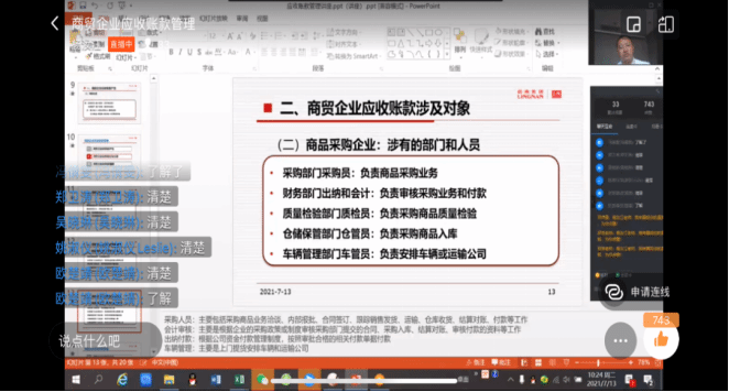 讲座中,杨汝江导师分别为同学们讲解了商贸企业应收账款的产生、涉及对象及管理三部分的内容。在第一部分中,杨汝江导师重点为同学们讲解商贸企业的应收账款是如何产生的,以及账务处理时应收账款和合同资产的区别。在第二部分中,杨汝江导师为同学们详细介绍了在商品的销售企业、采购企业中,应收账款所涉及的部门和人员,同时强调了当企业的应收账款出现问题时,应该将责任落实到具体的部门和人员中。最后,杨汝江导师从制度、风险控制、赊销和责任追究四个方面展开,为同学们具体讲述了商贸企业应收账款管理的内容。