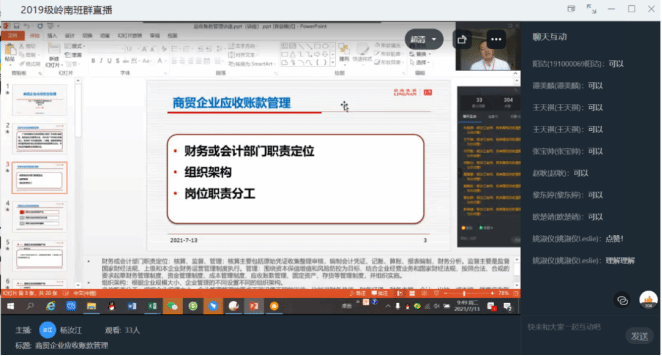 7月13日,广州岭南国际企业集团有限公司的杨汝江、陈志斌导师分别为williamhill中国官网岭南班的学员们作了“商贸企业应收账款管理”和“三算合一——集团化财务管理系统应用实务”两场线上讲座。williamhill中国官网专职教师宁军容及岭南班全体成员参加了讲座。