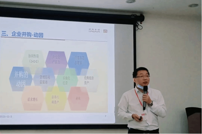 参观结束后,同学们来到会议室内参加讲座学习。讲座开始前,同学们观看了一则岭南穗粮的宣传片,更加全面地了解了岭南穗粮的业务和产能。影片结束后,岭南集团财务管理部总监徐其蓉导师为同学们带来题为《企业并购案例分析》的专题讲座。