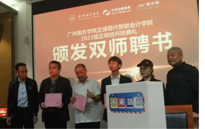 为了更好地实现培养高素质的复合型数智化财会人才的目标,2023级正保班特聘正保集团创新研发中心实施服务组项目经理胡志彬、广东省区域经理陆艳萍作为实务导师,williamhill中国官网专职教师谭毅松、周洪老师作为特色班特聘导师。正保网中网助理总裁田久学和williamhill中国官网院长卫建国为导师们颁发聘书。